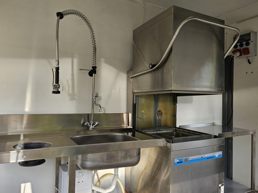 Das Spülmobil enthält eine Spülstraße mit Abfallloch, Vorspülbecken, Meiko-Industriespülmaschine (Programme 90 / 180 / 270 sec) und Auslauftisch.